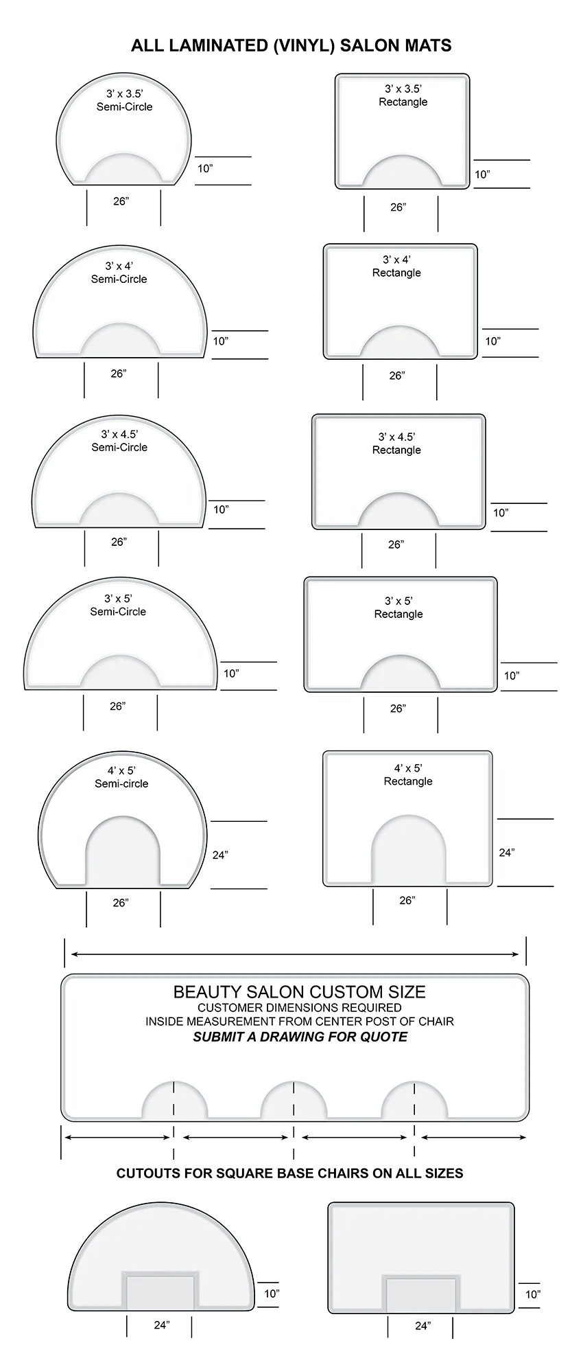 Salon Styling MatRectangle Shape Mat Platinum Color Rhino Hide 3 feet wide x 4.5 feet deepChoose 1/2″ or 7/8″ Double Thick SpongeChoose Square or Round base indentationUltra comfortable Anti fatigue matThank you for your patronage of a USA company. We strive to sell more USA made items all