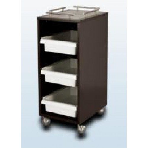 Includes three 4″ pull-out trays. The top features an inlaid